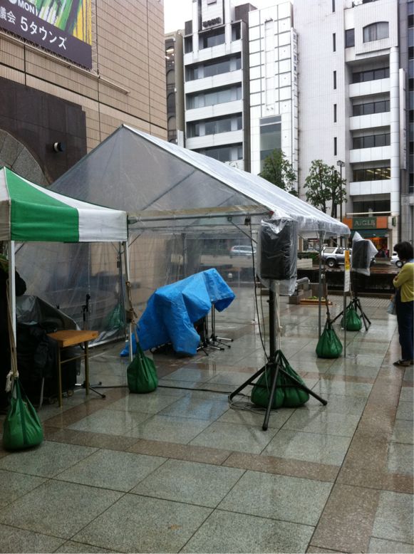 雨の中テントを建てての演奏です。